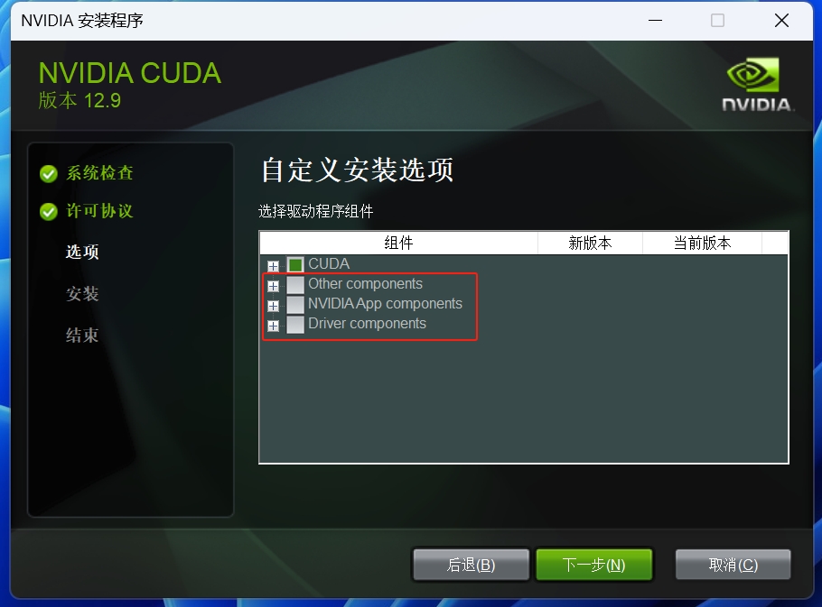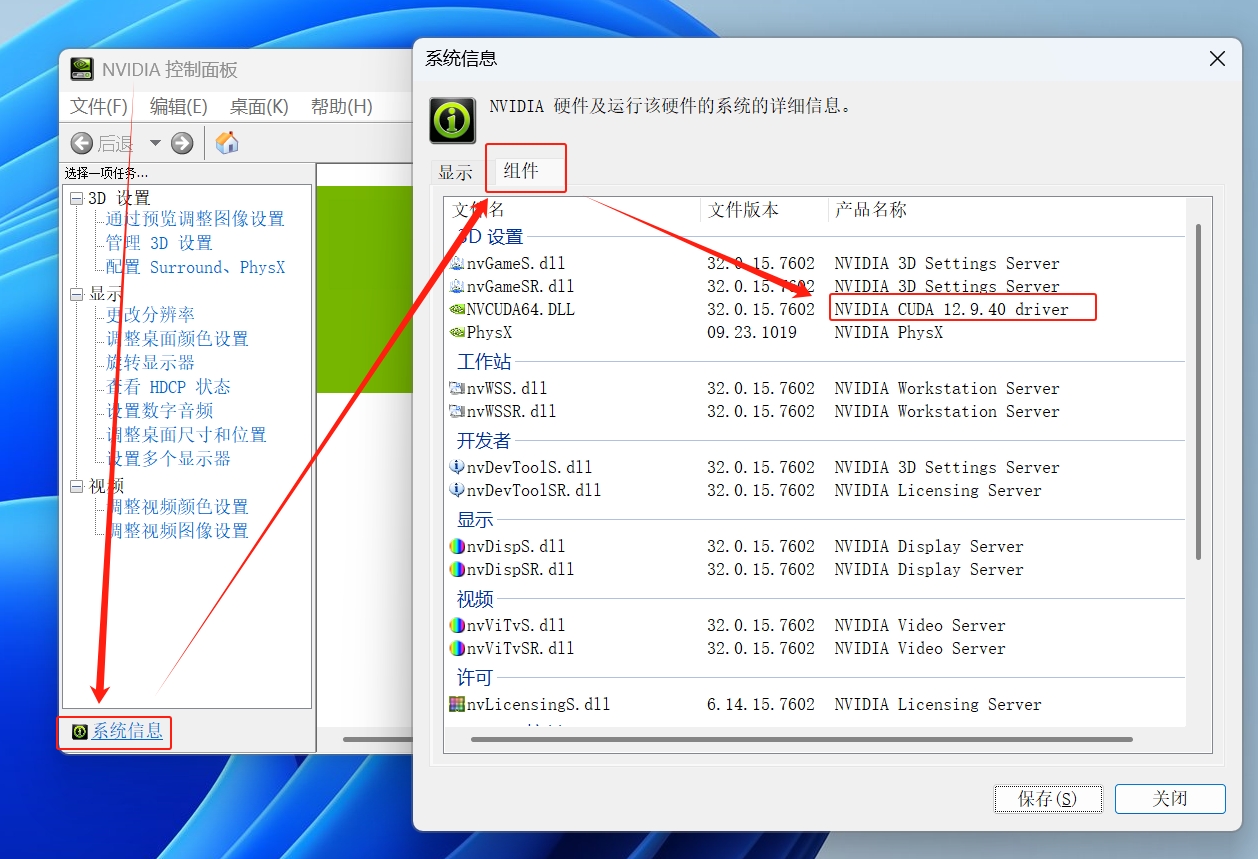 找到左下角的系统信息,点击组件,出下以下界面;从 NVCUDA64.DLL 这一行后面的 CUDA 12.9.40 说明我的电脑所支持的最高版本是 12.9 。