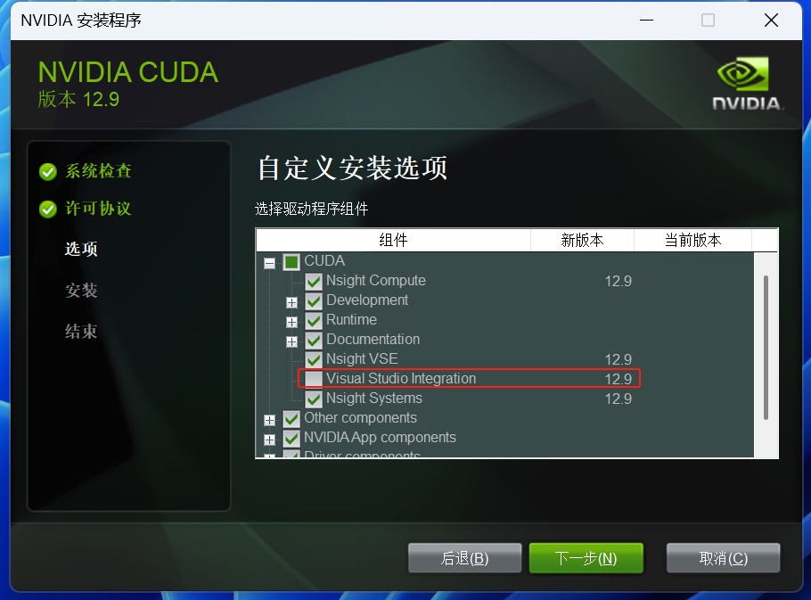 在安装 CUDA 中取消这个 Visual Studio Integration 有关的组件: