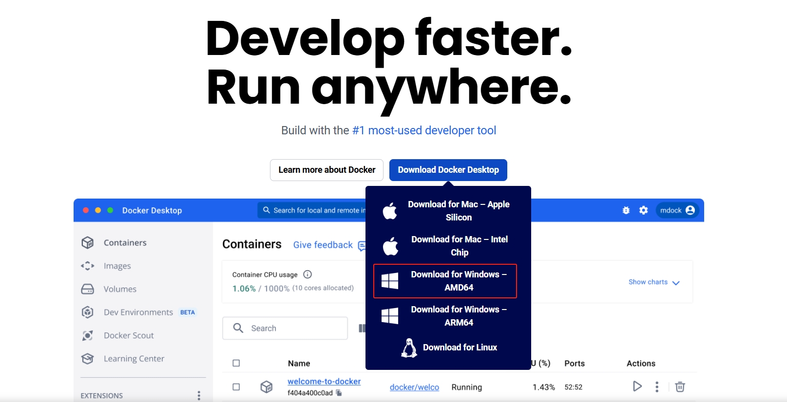 打开 Docker 官网:https://www.docker.com/,并下载Docker Desktop Installer.exe文件: