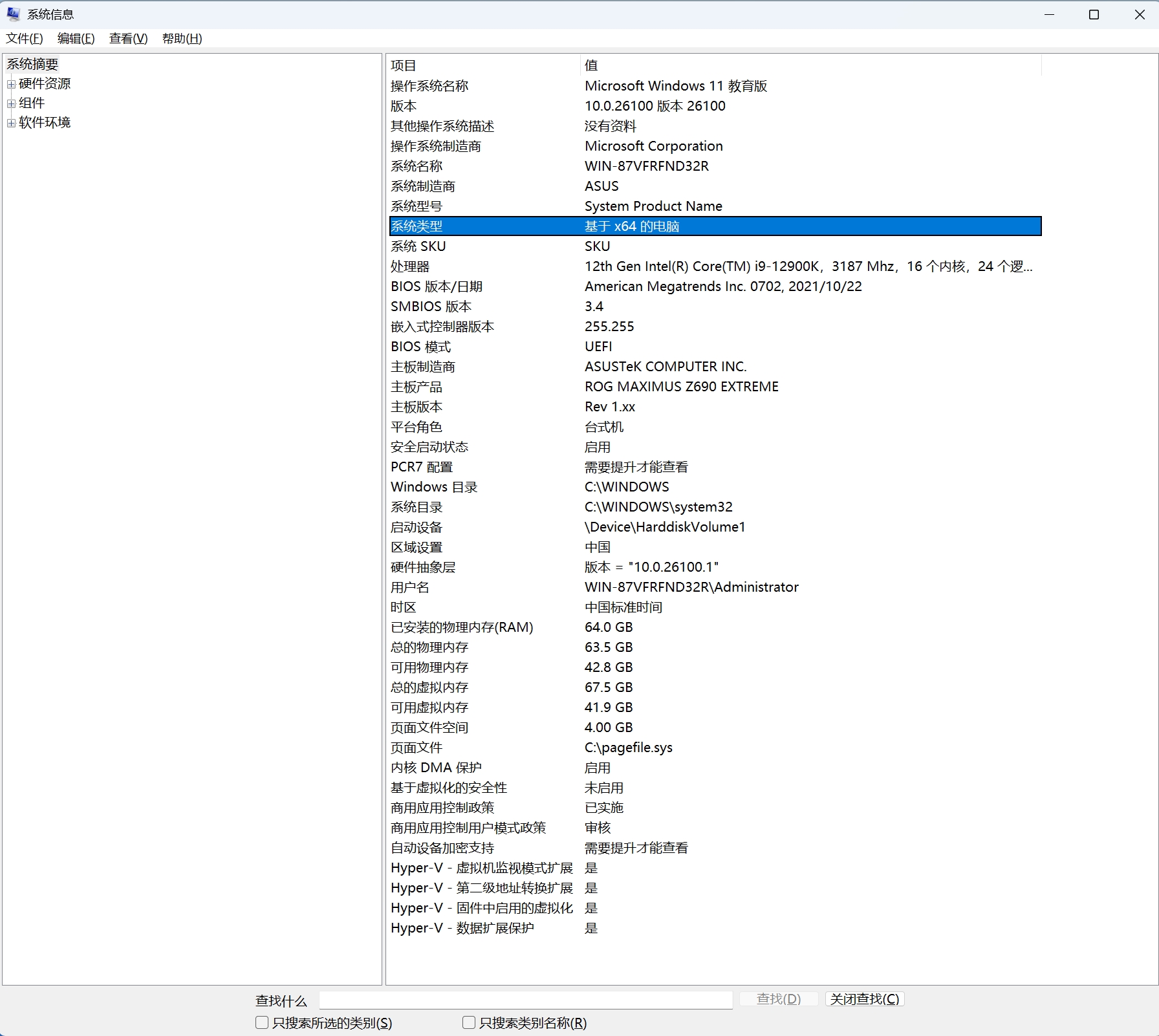 msinfo32,然后按Enter键; - 在系统信息窗中,查找系统类型字段,如果显示基于 x64 的电脑,则操作系统是 64 位的,通常对应的是 AMD 架构;如果显示 AMR 基于电脑,则操作系统是 ARM 架构的。