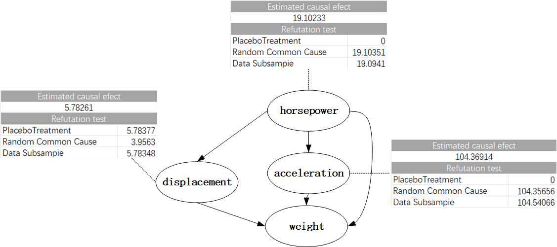 treatment_variable = 'acceleration' outcome_variable = 'weight' model = CausalModel( data = df_causally, treatment = treatment_variable, outcome = outcome_variable, graph = str_to_dot(graph_dot.source) ) identified_estimand = model.identify_effect(proceed_when_unidentifiable = True) print(identified_estimand) estimate = model.estimate_effect( identified_estimand, method_name = "backdoor.linear_regression", control_value = 0, treatment_value = 1, confidence_intervals = True, test_significance = True ) print("Causal Estimate is " + str(estimate.value)) refute1_results = model.refute_estimate( identified_estimand, estimate, method_name = "random_common_cause" ) print(refute1_results) refute2_results = model.refute_estimate( identified_estimand, estimate, method_name = "placebo_treatment_refuter" ) print(refute2_results) refute3_results = model.refute_estimate( identified_estimand, estimate, method_name = "data_subset_refuter" ) print(refute3_results) if True: