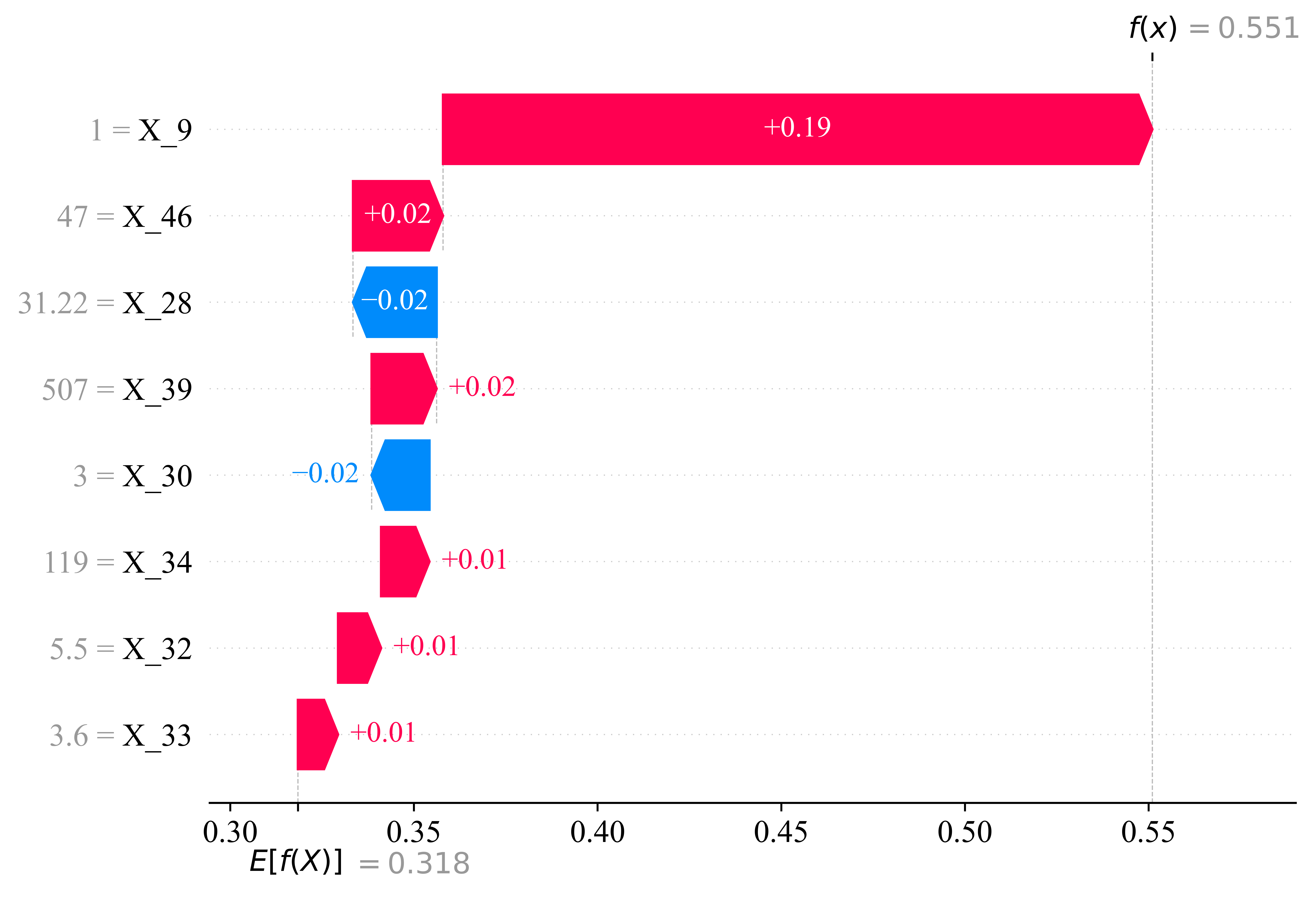 if True: X = df.drop(['y'], axis = 1) y = df['y'] X_train, X_test, y_train, y_test = train_test_split( X, y, test_size = 0.3, random_state = 42, stratify = df['y'] ) if True: lgbm_clf = lgb.LGBMClassifier(random_state = 42, verbose = -1) lgbm_clf.fit(X_train, y_train) feature_importances = lgbm_clf.feature_importances_ feature_importance_df = pd.DataFrame({ 'Feature': X.columns, 'Importance': feature_importances }).sort_values(by = 'Importance', ascending = False) top_n = 30 top_features = feature_importance_df.head(top_n) plt.figure(figsize = (12, 8), dpi = 1200) plt.barh(top_features['Feature'], top_features['Importance'], color = 'skyblue') plt.xlabel('Importance', fontsize = 14) plt.ylabel('Feature', fontsize = 14) plt.title(f'Top {top_n} Feature Importance', fontsize = 16) plt.xticks(fontsize = 12) plt.yticks(fontsize = 12) plt.gca().invert_yaxis() plt.savefig(f'{wkdir}/特征筛选.png', bbox_inches = 'tight') plt.close() if True: selection_results = pd.DataFrame(columns = ['Feature', 'Importance', 'Mean_ROC']) selected_features = [] kf = KFold(n_splits = 5, shuffle = True, random_state = 42) n_splits = kf.get_n_splits() fold_columns = [f'Fold_{i+1}_ROC' for i in range(n_splits)] for i in range(len(top_features)): current_feature = top_features.iloc[i]['Feature'] selected_features.append(current_feature) fold_roc_scores = [] for train_idx, val_idx in kf.split(X_train): X_train_fold, X_val_fold = X_train.iloc[train_idx][selected_features], X_train.iloc[val_idx][selected_features] y_train_fold, y_val_fold = y_train.iloc[train_idx], y_train.iloc[val_idx] lgbm_clf = lgb.LGBMClassifier(random_state = 42, verbose = -1) lgbm_clf.fit(X_train_fold, y_train_fold) y_val_proba = lgbm_clf.predict_proba(X_val_fold)[:, 1] fold_roc_score = roc_auc_score(y_val_fold, y_val_proba) fold_roc_scores.append(fold_roc_score) mean_roc_score = np.mean(fold_roc_scores) row_data = { 'Feature': current_feature, 'Importance': top_features.iloc[i]['Importance'], 'Mean_ROC': mean_roc_score, } for j, score in enumerate(fold_roc_scores): row_data[fold_columns[j]] = score row_df = pd.DataFrame([row_data]) selection_results = pd.concat([selection_results, row_df], ignore_index = True) selection_results if True: selection_results['Importance'] = ( selection_results['Importance'] / selection_results['Importance'].sum() ) selection_results if True: fold_columns = [col for col in selection_results.columns if 'Fold_' in col] selection_results['CI_Lower'] = None selection_results['CI_Upper'] = None for index, row in selection_results.iterrows(): fold_roc_scores = [row[fold] for fold in fold_columns] n_folds = len(fold_roc_scores) mean_roc = row['Mean_ROC'] std_err = stats.sem(fold_roc_scores) t_value = stats.t.ppf(0.975, df=n_folds - 1) ci_lower = mean_roc - t_value * std_err ci_upper = mean_roc + t_value * std_err ci_upper = min(ci_upper, 1) selection_results.at[index, 'CI_Lower'] = ci_lower selection_results.at[index, 'CI_Upper'] = ci_upper selection_results if True: selection_results['Importance'] = pd.to_numeric(selection_results['Importance'], errors = 'coerce') selection_results['CI_Lower'] = pd.to_numeric(selection_results['CI_Lower'], errors = 'coerce') selection_results['CI_Upper'] = pd.to_numeric(selection_results['CI_Upper'], errors = 'coerce') n_features = 7 fig, ax1 = plt.subplots(figsize = (16, 6), dpi = 1200) norm = plt.Normalize(selection_results['Importance'].min(), selection_results['Importance'].max()) colors = plt.cm.Blues(norm(selection_results['Importance'])) ax1.bar(selection_results['Feature'], selection_results['Importance'], color = colors, label = 'Feature Importance') ax1.set_xlabel("Features", fontsize = 18, fontweight = 'bold') ax1.set_ylabel("Feature Importance", fontsize = 18, fontweight = 'bold') ax1.tick_params(axis = 'y', labelsize = 12, width = 1.5) x_labels = selection_results['Feature'] x_colors = ['red' if i < n_features else 'black' for i in range(len(x_labels))] for tick_label, color in zip(ax1.get_xticklabels(), x_colors): tick_label.set_color(color) ax1.tick_params(axis = 'x', rotation = 45, labelsize = 12, width = 1.5) ax2 = ax1.twinx() ax2.plot( selection_results['Feature'][:n_features + 1], selection_results['Mean_ROC'][:n_features + 1], color = "red", marker = 'o', linestyle = '-', label = "Mean AUC (Top Features)" ) ax2.plot( selection_results['Feature'][n_features:], selection_results['Mean_ROC'][n_features:], color = "black", marker = 'o', linestyle = '-', label = "Mean AUC (Other Features)" ) ax2.fill_between( selection_results['Feature'], selection_results['CI_Lower'], selection_results['CI_Upper'], color = 'red', alpha = 0.2, ) ax2.set_ylabel("Mean AUC", fontsize = 18, fontweight = 'bold') ax2.tick_params(axis = 'y', labelsize = 12, width = 1.5) ax2.yaxis.set_major_formatter(plt.FuncFormatter(lambda x, _: f'{x:.3f}')) plt.title(f"Feature Contribution and AUC Performance (Top {n_features} Features Highlighted)", fontsize = 18, fontweight = 'bold') fig.tight_layout() plt.savefig(f"{wkdir}/特征曲线.png", bbox_inches = 'tight') plt.close() list(selection_results['Feature'][0:8]) if True: X = df[['X_30', 'X_39', 'X_46', 'X_32', 'X_34', 'X_33', 'X_9', 'X_28']] y = df['y'] X_train, X_test, y_train, y_test = train_test_split( X, y, test_size = 0.3, random_state = 42, stratify = df['y'] ) if True: