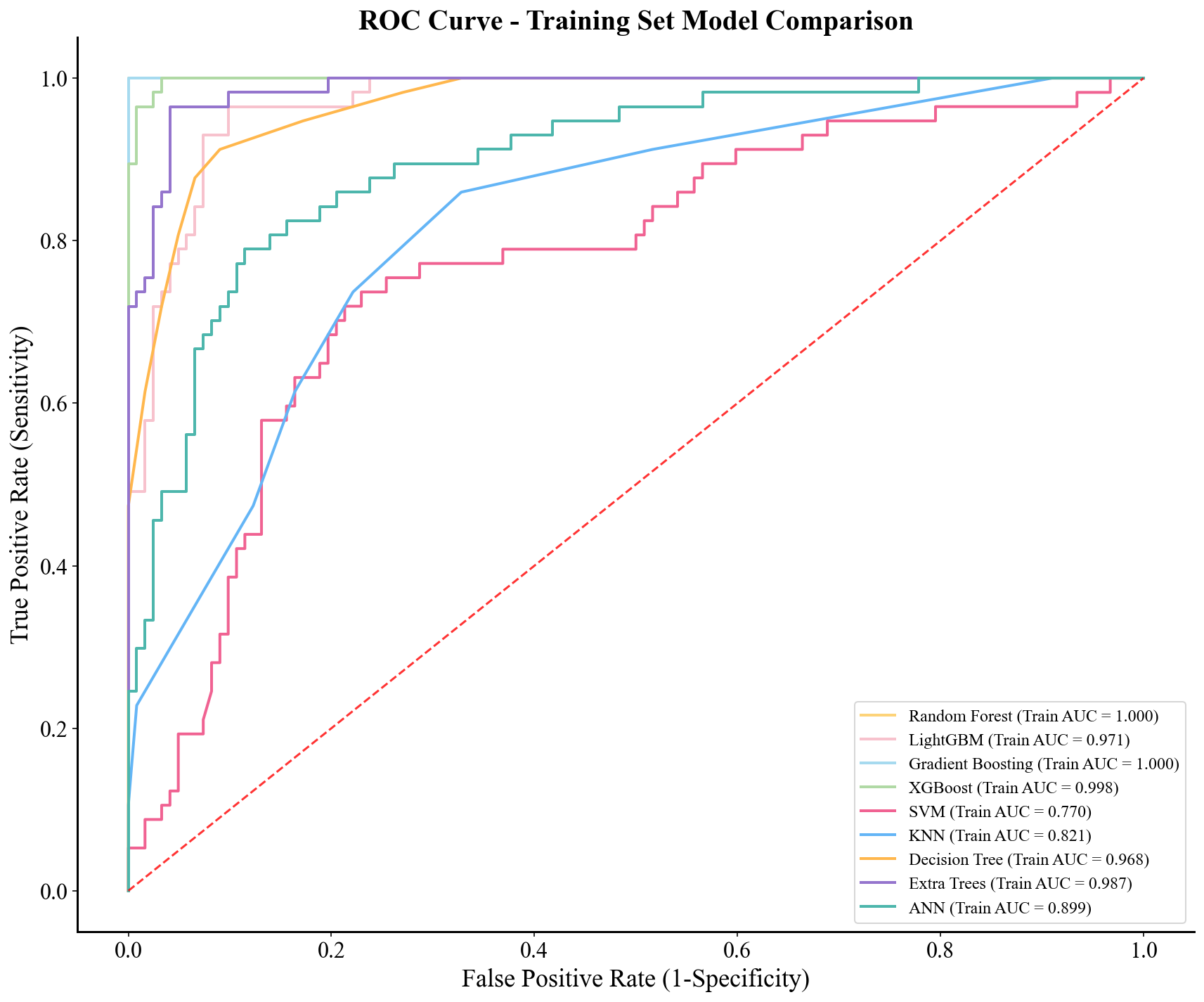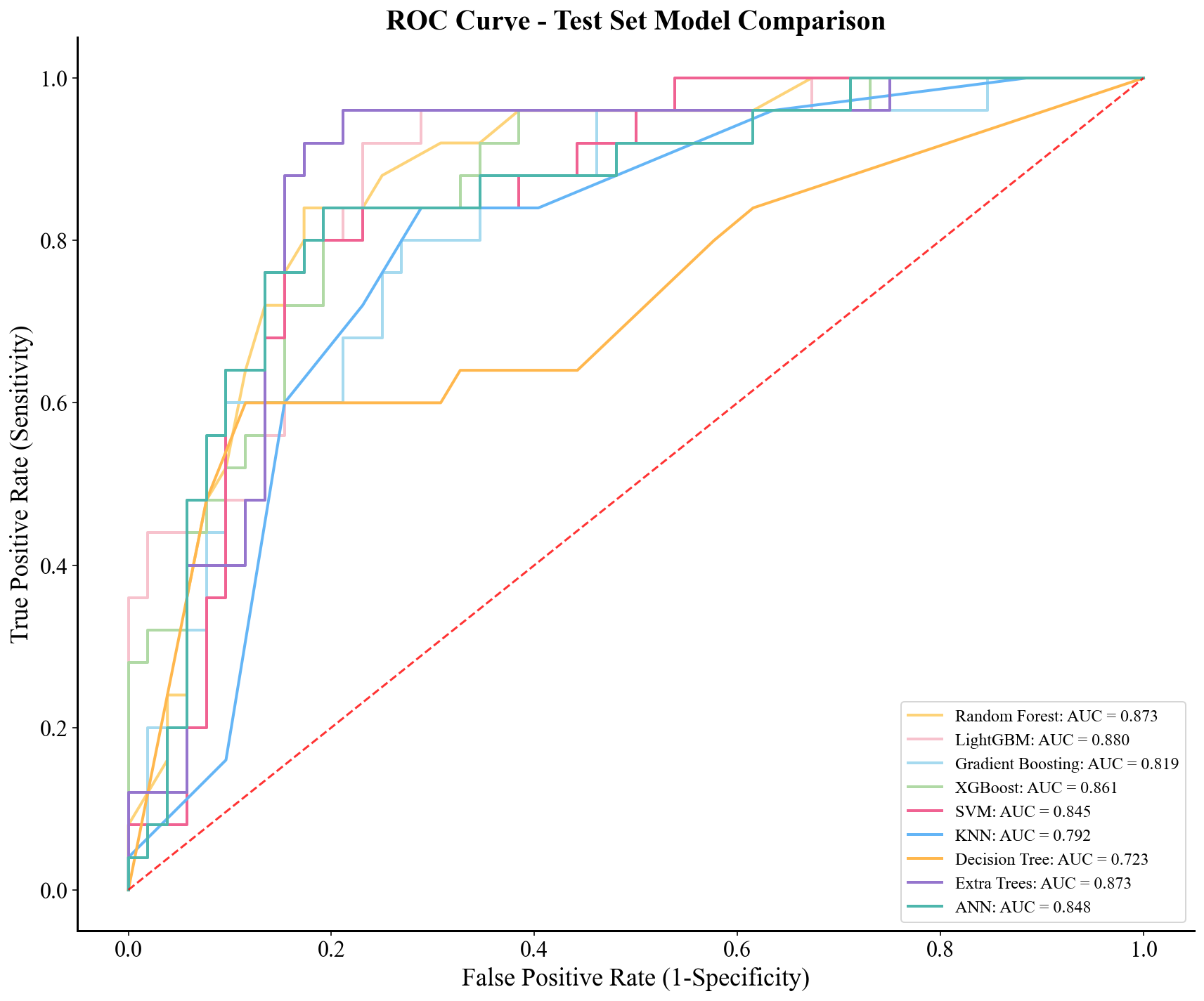 model_xgb = XGBClassifier(use_label_encoder = False, eval_metric = 'logloss', random_state = 42) param_grid_xgb = { 'n_estimators': [50, 100, 200], 'learning_rate': [0.01, 0.1, 0.2], 'max_depth': [3, 5, 10], 'subsample': [0.8, 1.0], 'colsample_bytree': [0.8, 1.0] } grid_search_xgb = GridSearchCV( estimator = model_xgb, param_grid = param_grid_xgb, scoring = 'neg_log_loss', cv = 5, n_jobs = -1, verbose = 1 ) grid_search_xgb.fit(X_train, y_train) best_model_xgb = grid_search_xgb.best_estimator_ y_pred = best_model_xgb.predict(X_test) print(classification_report(y_test, y_pred)) plot_confusion_matrix_plus(y_test, y_pred, title = '', labels = {1:"Hyperplasia", 0:"Normal"}, save_path = None) if True: models = { "Random Forest": {"model": best_model_rf, "color": "#FDD379"}, "LightGBM": {"model": best_model_lgbm, "color": "#F7C2CD"}, "Gradient Boosting": {"model": best_model_gbm, "color": "#A6DAEF"}, "XGBoost": {"model": best_model_xgb, "color": "#B0D9A5"}, "SVM": {"model": best_model_svm, "color": "#F06292"}, "KNN": {"model": best_model_knn, "color": "#64B5F6"}, "Decision Tree": {"model": best_model_dt, "color": "#FFB74D"}, "Extra Trees": {"model": best_model_et, "color": "#9575CD"}, "ANN": {"model": best_model_ann, "color": "#4DB6AC"} } plt.figure(figsize = (12, 10)) for name, info in models.items(): model = info["model"] color = info["color"] try: y_pred = model.predict_proba(X_test)[:, 1] except AttributeError: y_pred = model.decision_function(X_test) y_pred = (y_pred - y_pred.min()) / (y_pred.max() - y_pred.min()) fpr, tpr, _ = roc_curve(y_test, y_pred) roc_auc = auc(fpr, tpr) plt.plot(fpr, tpr, label = f"{name}: AUC = {roc_auc:.3f}", color = color, linewidth = 2) plt.plot([0, 1], [0, 1], 'r--', linewidth = 1.5, alpha = 0.8) plt.title("ROC Curve - Test Set Model Comparison", fontsize = 20, fontweight = "bold") plt.xlabel("False Positive Rate (1-Specificity)", fontsize = 18) plt.ylabel("True Positive Rate (Sensitivity)", fontsize = 18) plt.xticks(fontsize = 16) plt.yticks(fontsize = 16) plt.legend(loc = "lower right", fontsize = 12) plt.gca().spines['top'].set_visible(False) plt.gca().spines['right'].set_visible(False) plt.gca().spines['left'].set_linewidth(1.5) plt.gca().spines['bottom'].set_linewidth(1.5) plt.grid(False) plt.tight_layout() plt.savefig(f"{wkdir}/Test-AUC.png", bbox_inches = 'tight') plt.close() if True: plt.figure(figsize = (12, 10)) for name, info in models.items(): model = info["model"] color = info["color"] try: y_pred = model.predict_proba(X_train)[:, 1] except AttributeError: y_pred = model.decision_function(X_train) y_pred = (y_pred - y_pred.min()) / (y_pred.max() - y_pred.min()) fpr, tpr, _ = roc_curve(y_train, y_pred) roc_auc = auc(fpr, tpr) plt.plot(fpr, tpr, label=f"{name} (Train AUC = {roc_auc:.3f})", color = color, linewidth = 2) plt.plot([0, 1], [0, 1], 'r--', linewidth = 1.5, alpha = 0.8) plt.title("ROC Curve - Training Set Model Comparison", fontsize = 20, fontweight = "bold") plt.xlabel("False Positive Rate (1-Specificity)", fontsize = 18) plt.ylabel("True Positive Rate (Sensitivity)", fontsize = 18) plt.xticks(fontsize = 16) plt.yticks(fontsize = 16) plt.legend(loc="lower right", fontsize = 12) plt.gca().spines['top'].set_visible(False) plt.gca().spines['right'].set_visible(False) plt.gca().spines['left'].set_linewidth(1.5) plt.gca().spines['bottom'].set_linewidth(1.5) plt.grid(False) plt.tight_layout() plt.savefig(f"{wkdir}/Train-AUC.png", bbox_inches = 'tight') plt.close() if True: