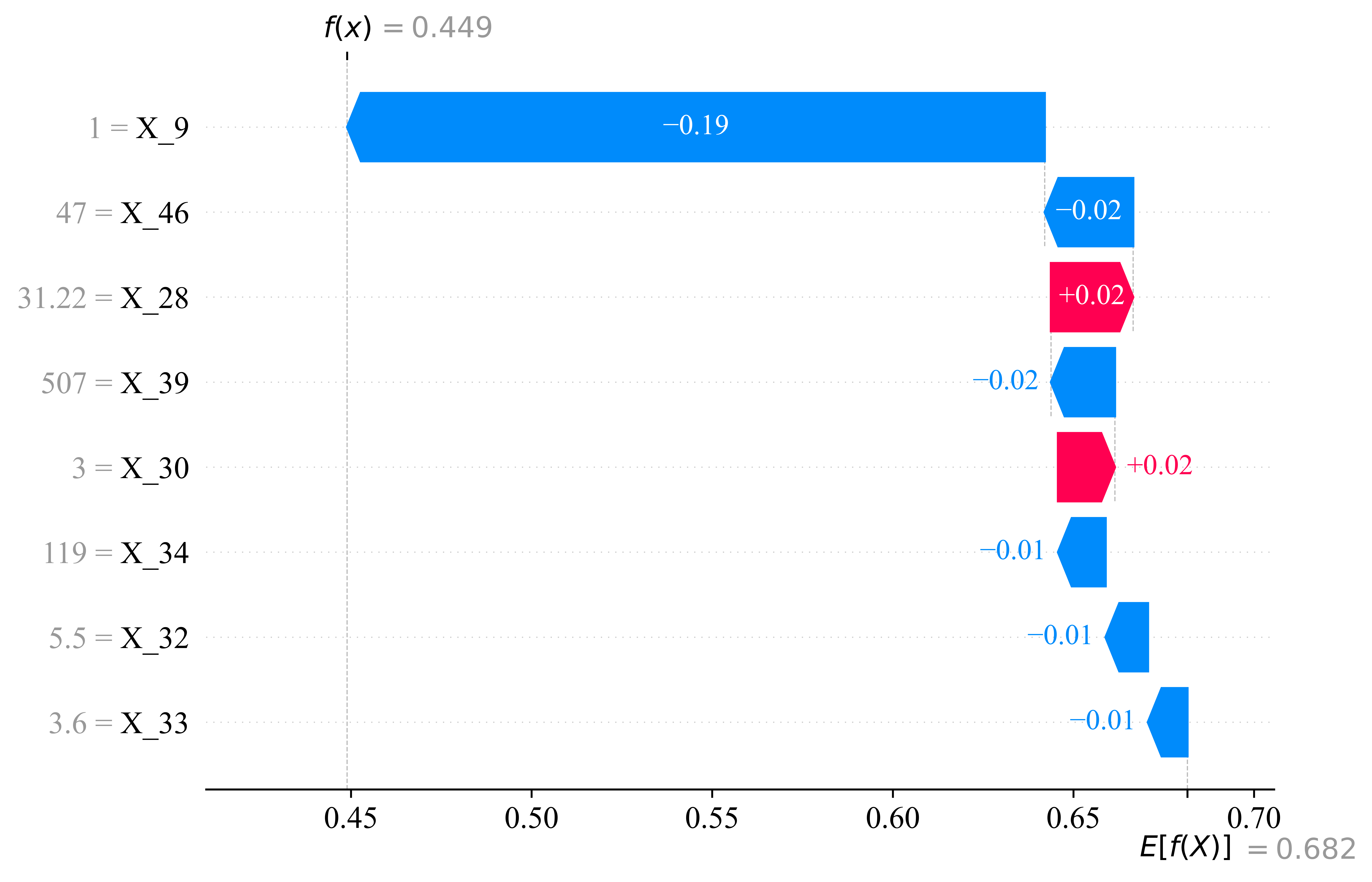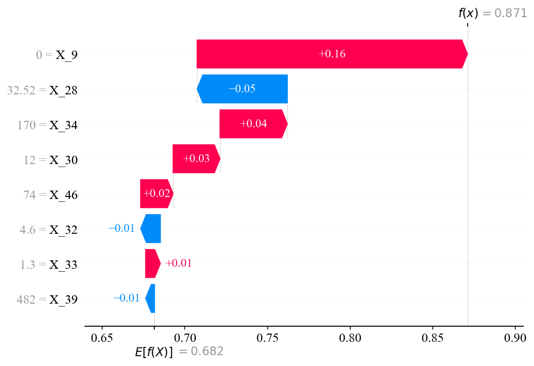 pr_display = PrecisionRecallDisplay.from_estimator( best_model_et, X_train, y_train, plot_chance_level = True, name = "AdaBoost" ) _ = pr_display.ax_.set_title("Train set Precision-Recall curve") plt.savefig(f'{wkdir}/Precision-Recall-Train.png', bbox_inches = 'tight', dpi = 1200) plt.close() if True: y_train_pred = best_model_et.predict_proba(X_train)[:, 1] y_test_pred = best_model_et.predict_proba(X_test)[:, 1] fpr_train, tpr_train, _ = roc_curve(y_train, y_train_pred) fpr_test, tpr_test, _ = roc_curve(y_test, y_test_pred) roc_auc_train = auc(fpr_train, tpr_train) roc_auc_test = auc(fpr_test, tpr_test) plt.figure(figsize=(10, 8)) plt.plot(fpr_train, tpr_train, label = f"Train: AUC={roc_auc_train:.3f} (n={len(y_train)})", color = "#CECCE5", linewidth = 2) plt.plot(fpr_test, tpr_test, label = f"Test: AUC={roc_auc_test:.3f} (n={len(y_test)})", color = "#B0D9A5", linewidth = 2) plt.plot([0, 1], [0, 1], 'r--', linewidth = 1.5, alpha = 0.8) plt.title("ROC Curve - AdaBoost (Train & Test)", fontsize = 20, fontweight = "bold") plt.xlabel("False Positive Rate (1-Specificity)", fontsize = 18) plt.ylabel("True Positive Rate (Sensitivity)", fontsize = 18) plt.xticks(fontsize = 16) plt.yticks(fontsize = 16) plt.legend(loc="lower right", fontsize = 12) plt.gca().spines['top'].set_visible(False) plt.gca().spines['right'].set_visible(False) plt.gca().spines['left'].set_linewidth(1.5) plt.gca().spines['bottom'].set_linewidth(1.5) plt.grid(False) plt.tight_layout() plt.savefig(f"{wkdir}/AdaBoost.png", bbox_inches = 'tight') plt.close() if True: explainer = shap.TreeExplainer(best_model_et) shap_values = explainer.shap_values(X_test) shap_values_class_0 = shap_values[:, :, 0] shap_values_class_1 = shap_values[:, :, 1] plt.figure(figsize = (10, 5), dpi = 1200) shap.summary_plot(shap_values_class_1, X_test, plot_type = "bar", show = False) plt.title('SHAP_numpy Sorted Feature Importance') plt.tight_layout() plt.savefig(f"{wkdir}/SHAP_numpy Sorted Feature Importance.png", bbox_inches = 'tight') plt.close() plt.figure() shap.summary_plot(shap_values_class_0, X_test, feature_names = X_test.columns, plot_type = "dot", show = False) plt.savefig(f"{wkdir}/SHAP_numpy Sorted Feature Importance.dot.png", bbox_inches = 'tight') plt.close() shap_values_df_1 = pd.DataFrame(shap_values_class_0, columns = X_test.columns) shap_values_df_1.head() if True: features = shap_values_df_1.columns.tolist() fig, axes = plt.subplots(3, 3, figsize = (10, 10), dpi = 1200) axes = axes.flatten() for i in range(len(axes)): if i < len(features): feature = features[i] if feature in X_test.columns and feature in shap_values_df_1.columns: ax = axes[i] ax.scatter(X_test[feature], shap_values_df_1[feature], s = 10, color = "#6A9ACE") ax.axhline(y = 0, color = 'red', linestyle = '-.', linewidth = 1) ax.set_xlabel(feature, fontsize = 10) ax.set_ylabel(f'SHAP value for\n{feature}', fontsize = 10) ax.spines['top'].set_visible(False) ax.spines['right'].set_visible(False) else: axes[i].axis('off') else: axes[i].axis('off') plt.tight_layout() plt.savefig(f"{wkdir}/SHAP value for features.png", bbox_inches = 'tight') plt.close() if True: y_pred_et = best_model_et.predict(X_test) explainer = shap.TreeExplainer(best_model_et) shap_values_Explanation = explainer(X_test) shap_values_class_0 = shap_values_Explanation[:, :, 0] shap_values_class_1 = shap_values_Explanation[:, :, 1] if True: plt.figure(figsize = (10, 5), dpi = 1200) shap.plots.waterfall(shap_values_class_0[0], show = False, max_display = 8) plt.savefig(f"{wkdir}/绘制第 1 个样本 0 类别的 SHAP 瀑布图.png", bbox_inches = 'tight') plt.tight_layout() plt.close() plt.figure(figsize = (10, 5), dpi = 1200) shap.plots.waterfall(shap_values_class_1[0], show = False, max_display = 8) plt.savefig(f"{wkdir}/绘制第 1 个样本 1 类别的 SHAP 瀑布图.png", bbox_inches = 'tight') plt.tight_layout() plt.show() if True: plt.figure(figsize = (10, 5), dpi = 1200) shap.plots.waterfall(shap_values_class_0[1], show = False, max_display = 8) plt.savefig(f"{wkdir}/绘制第 2 个样本0类别的 SHAP 瀑布图.png", bbox_inches = 'tight') plt.tight_layout() plt.show() plt.figure(figsize = (10, 5), dpi = 1200) shap.plots.waterfall(shap_values_class_1[1], show = False, max_display = 8) plt.savefig(f"{wkdir}/绘制第 2 个样本1类别的 SHAP 瀑布图.png", bbox_inches = 'tight') plt.tight_layout() plt.show()