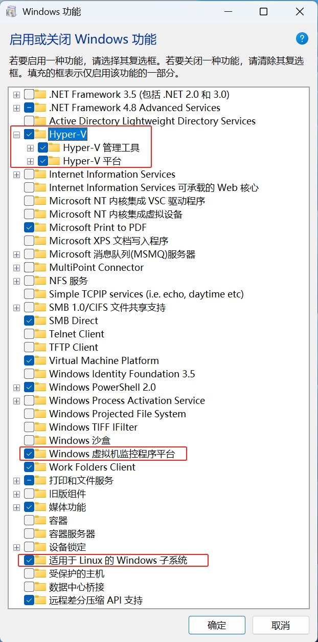 注意如果系统版本为家庭版的用户在 Windows 功能中没有”虚拟机平台”这一项,需要用管理员身份启动 Windows PowerShell 额外使用如下命令开启,接着在如下网站里下载 Windows 内核功能包安装插件并重启电脑即可。