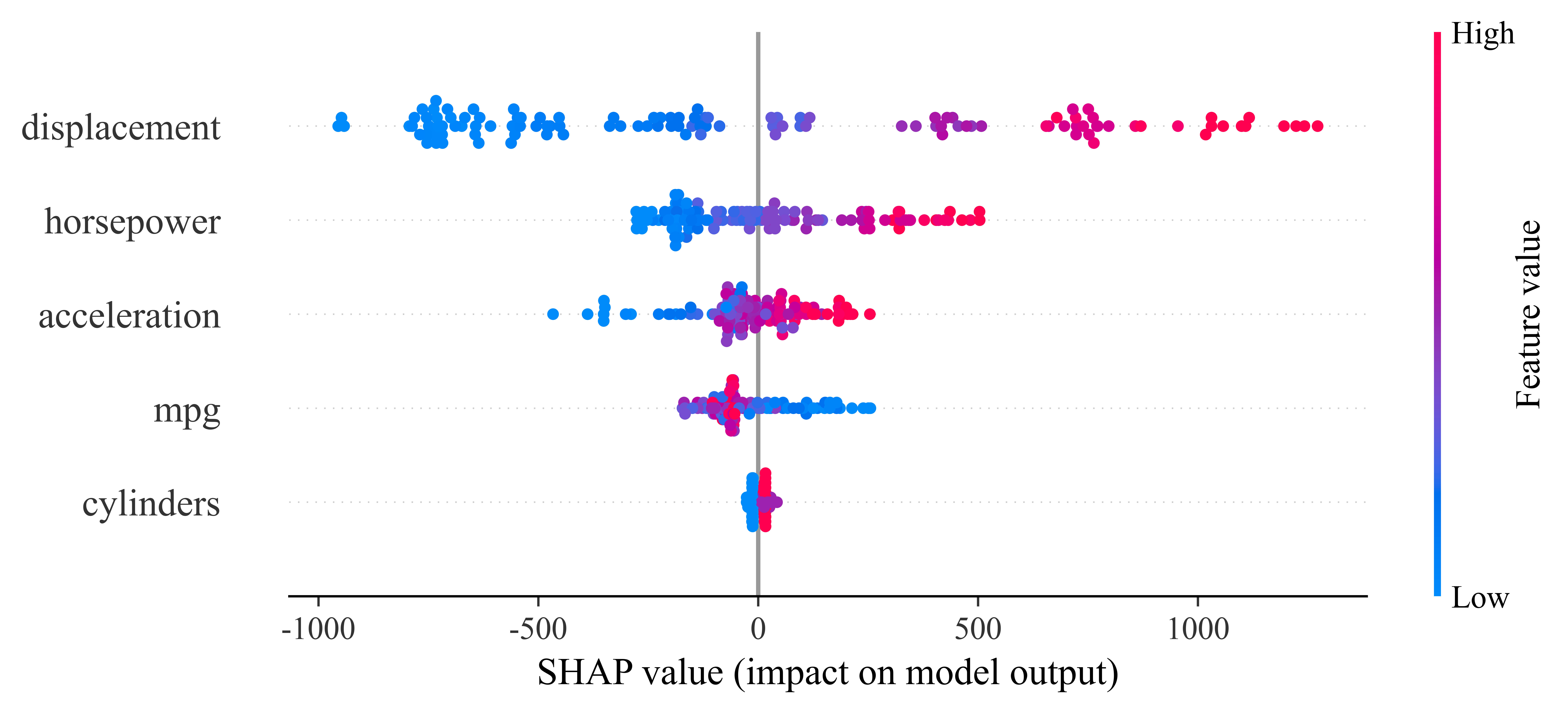 print("\n测试集评价指标:") print("均方误差 (MSE):", mse_test) print("均方根误差 (RMSE):", rmse_test) print("平均绝对误差 (MAE):", mae_test) print("拟合优度 (R-squared):", r2_test) if True: explainer = shap.TreeExplainer(best_model_lgbm) shap_values = explainer.shap_values(X_test) plt.figure(figsize = (10, 5)) shap.summary_plot(shap_values, X_test, plot_type = "bar", show = False) plt.tight_layout() plt.savefig('C:/Users/Administrator/Desktop/barplot.png', format = 'png',bbox_inches = 'tight', dpi = 1200) plt.show() plt.figure(figsize = (10, 5)) shap.summary_plot(shap_values , X_test, feature_names = X_test.columns, plot_type = "dot", show = False) plt.savefig('C:/Users/Administrator/Desktop/dotplot.png', format = 'png',bbox_inches = 'tight', dpi = 1200) plt.show() df_causally = df[['displacement', 'horsepower', 'acceleration', 'weight']] df_causally if True: labels = [f'{col}' for i, col in enumerate(df_causally.columns)] data = df_causally.to_numpy() model_lingam = lingam.ICALiNGAM() model_lingam.fit(data) dot_graph = make_dot(model_lingam.adjacency_matrix_, labels=labels) dot_graph.render("C:/Users/Administrator/Desktop//lingam_causal_graph", format = "png")