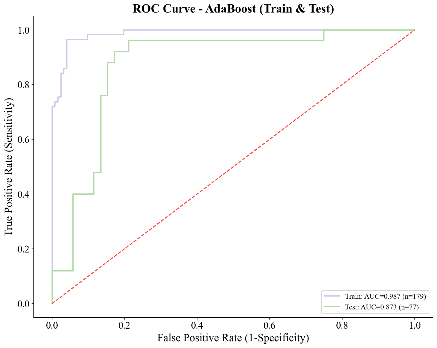pr_display = PrecisionRecallDisplay.from_estimator( best_model_et, X_train, y_train, plot_chance_level = True, name = "AdaBoost" ) _ = pr_display.ax_.set_title("Train set Precision-Recall curve") plt.savefig(f'{wkdir}/Precision-Recall-Train.png', bbox_inches = 'tight', dpi = 1200) plt.close() if True: y_train_pred = best_model_et.predict_proba(X_train)[:, 1] y_test_pred = best_model_et.predict_proba(X_test)[:, 1] fpr_train, tpr_train, _ = roc_curve(y_train, y_train_pred) fpr_test, tpr_test, _ = roc_curve(y_test, y_test_pred) roc_auc_train = auc(fpr_train, tpr_train) roc_auc_test = auc(fpr_test, tpr_test) plt.figure(figsize=(10, 8)) plt.plot(fpr_train, tpr_train, label = f"Train: AUC={roc_auc_train:.3f} (n={len(y_train)})", color = "#CECCE5", linewidth = 2) plt.plot(fpr_test, tpr_test, label = f"Test: AUC={roc_auc_test:.3f} (n={len(y_test)})", color = "#B0D9A5", linewidth = 2) plt.plot([0, 1], [0, 1], 'r--', linewidth = 1.5, alpha = 0.8) plt.title("ROC Curve - AdaBoost (Train & Test)", fontsize = 20, fontweight = "bold") plt.xlabel("False Positive Rate (1-Specificity)", fontsize = 18) plt.ylabel("True Positive Rate (Sensitivity)", fontsize = 18) plt.xticks(fontsize = 16) plt.yticks(fontsize = 16) plt.legend(loc="lower right", fontsize = 12) plt.gca().spines['top'].set_visible(False) plt.gca().spines['right'].set_visible(False) plt.gca().spines['left'].set_linewidth(1.5) plt.gca().spines['bottom'].set_linewidth(1.5) plt.grid(False) plt.tight_layout() plt.savefig(f"{wkdir}/AdaBoost.png", bbox_inches = 'tight') plt.close() if True: explainer = shap.TreeExplainer(best_model_et) shap_values = explainer.shap_values(X_test) shap_values_class_0 = shap_values[:, :, 0] shap_values_class_1 = shap_values[:, :, 1] plt.figure(figsize = (10, 5), dpi = 1200) shap.summary_plot(shap_values_class_1, X_test, plot_type = "bar", show = False) plt.title('SHAP_numpy Sorted Feature Importance') plt.tight_layout() plt.savefig(f"{wkdir}/SHAP_numpy Sorted Feature Importance.png", bbox_inches = 'tight') plt.close() plt.figure() shap.summary_plot(shap_values_class_0, X_test, feature_names = X_test.columns, plot_type = "dot", show = False) plt.savefig(f"{wkdir}/SHAP_numpy Sorted Feature Importance.dot.png", bbox_inches = 'tight') plt.close() shap_values_df_1 = pd.DataFrame(shap_values_class_0, columns = X_test.columns) shap_values_df_1.head() if True: features = shap_values_df_1.columns.tolist() fig, axes = plt.subplots(3, 3, figsize = (10, 10), dpi = 1200) axes = axes.flatten() for i in range(len(axes)): if i < len(features): feature = features[i] if feature in X_test.columns and feature in shap_values_df_1.columns: ax = axes[i] ax.scatter(X_test[feature], shap_values_df_1[feature], s = 10, color = "#6A9ACE") ax.axhline(y = 0, color = 'red', linestyle = '-.', linewidth = 1) ax.set_xlabel(feature, fontsize = 10) ax.set_ylabel(f'SHAP value for\n{feature}', fontsize = 10) ax.spines['top'].set_visible(False) ax.spines['right'].set_visible(False) else: axes[i].axis('off') else: axes[i].axis('off') plt.tight_layout() plt.savefig(f"{wkdir}/SHAP value for features.png", bbox_inches = 'tight') plt.close() if True: y_pred_et = best_model_et.predict(X_test) explainer = shap.TreeExplainer(best_model_et) shap_values_Explanation = explainer(X_test) shap_values_class_0 = shap_values_Explanation[:, :, 0] shap_values_class_1 = shap_values_Explanation[:, :, 1] if True: plt.figure(figsize = (10, 5), dpi = 1200) shap.plots.waterfall(shap_values_class_0[0], show = False, max_display = 8) plt.savefig(f"{wkdir}/绘制第 1 个样本 0 类别的 SHAP 瀑布图.png", bbox_inches = 'tight') plt.tight_layout() plt.close() plt.figure(figsize = (10, 5), dpi = 1200) shap.plots.waterfall(shap_values_class_1[0], show = False, max_display = 8) plt.savefig(f"{wkdir}/绘制第 1 个样本 1 类别的 SHAP 瀑布图.png", bbox_inches = 'tight') plt.tight_layout() plt.show() if True: plt.figure(figsize = (10, 5), dpi = 1200) shap.plots.waterfall(shap_values_class_0[1], show = False, max_display = 8) plt.savefig(f"{wkdir}/绘制第 2 个样本0类别的 SHAP 瀑布图.png", bbox_inches = 'tight') plt.tight_layout() plt.show() plt.figure(figsize = (10, 5), dpi = 1200) shap.plots.waterfall(shap_values_class_1[1], show = False, max_display = 8) plt.savefig(f"{wkdir}/绘制第 2 个样本1类别的 SHAP 瀑布图.png", bbox_inches = 'tight') plt.tight_layout() plt.show()