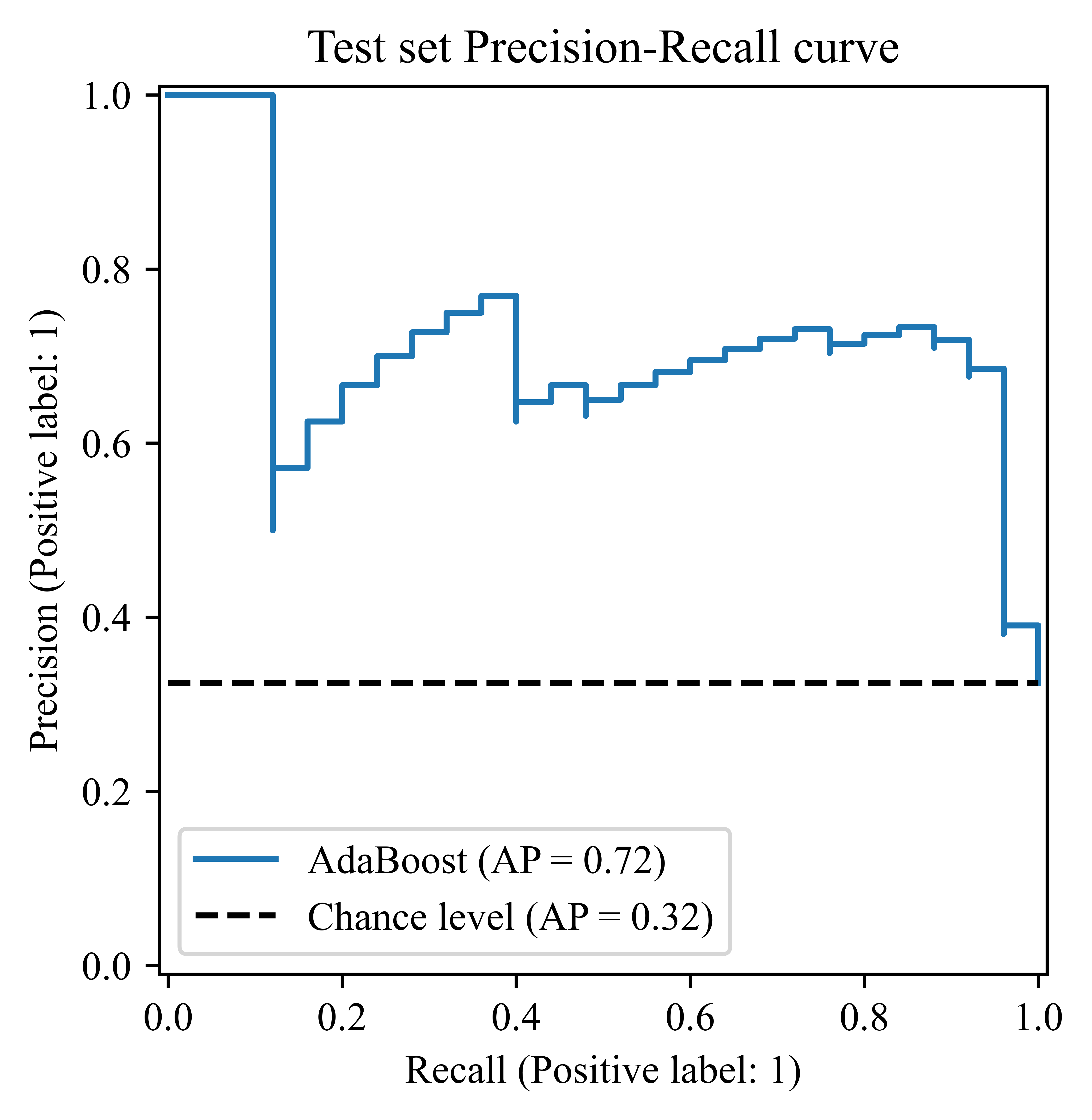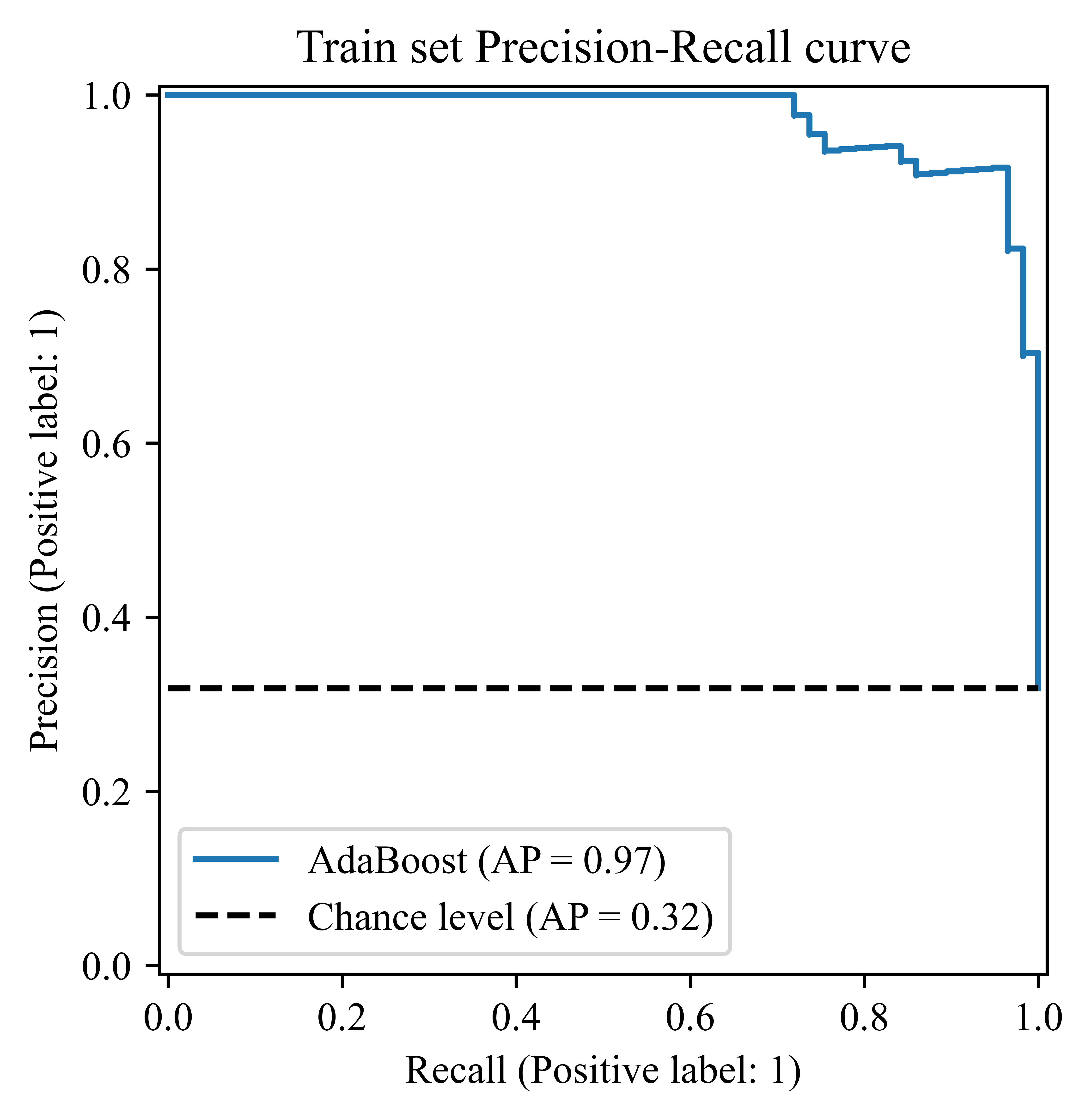 if True: df_selected = X_test pca = PCA(n_components = 1) pca_result = pca.fit_transform(df_selected) explained_variance = pca.explained_variance_ratio_ pca_df = pd.DataFrame(pca_result, columns = [f"PC1 ({explained_variance[0]*100:.2f}%)"]) pca_df.head() if True: combined_df = pd.concat([probability_df, pca_df, y_test.reset_index(drop = True)], axis = 1) combined_df.rename(columns = {y_test.name: 'True'}, inplace = True) if True: colors = combined_df['True'].map({0: '#A0D6B4', 1: '#C3A6D8'}) plt.figure(figsize = (10, 6), dpi = 1200) plt.scatter(combined_df['Prob_Class_1'], combined_df['PC1 (97.93%)'], c=colors, edgecolor = 'black', s = 100) plt.axvline(x = 0.5, color = 'gray', linestyle = '--') plt.xlabel('Predicted value for benign') plt.ylabel('PC1 (97.93%)') plt.title('Test set') for true_value, color, label in [(0, '#A0D6B4', 'malignant'), (1, '#C3A6D8', 'benign')]: plt.scatter([], [], color = color, edgecolor = 'black', s = 100, label = label) plt.legend(title = "Class", loc = "center left", bbox_to_anchor = (1, 0.5)) plt.tight_layout(rect = [0, 0, 0.85, 1]) plt.savefig(f'{wkdir}/分类效果-Test.png', bbox_inches = 'tight') plt.close() if True: probabilities = best_model_et.predict_proba(X_train) probability_df = pd.DataFrame(probabilities, columns = [f'Prob_Class_{i}' for i in range(probabilities.shape[1])]) probability_df.index = X_train.index probability_df.reset_index(drop = True, inplace = True) df_selected = X_train pca = PCA(n_components = 1) pca_result = pca.fit_transform(df_selected) explained_variance = pca.explained_variance_ratio_ pca_df = pd.DataFrame(pca_result, columns = [f"PC1 ({explained_variance[0]*100:.2f}%)"]) combined_df = pd.concat([probability_df, pca_df, y_train.reset_index(drop = True)], axis = 1) combined_df.rename(columns = {y_train.name: 'True'}, inplace = True) colors = combined_df['True'].map({0: '#A0D6B4', 1: '#C3A6D8'}) plt.figure(figsize = (10, 6),dpi = 1200) plt.scatter(combined_df['Prob_Class_1'], combined_df['PC1 (99.74%)'], c = colors, edgecolor = 'black', s = 100) plt.axvline(x = 0.5, color = 'gray', linestyle = '--') plt.xlabel('Predicted value for benign') plt.ylabel('PC1 (99.74%)') plt.title('Train set') for true_value, color, label in [(0, '#A0D6B4', 'malignant'), (1, '#C3A6D8', 'benign')]: plt.scatter([], [], color = color, edgecolor = 'black', s = 100, label = label) plt.legend(title = "Class", loc = "center left", bbox_to_anchor = (1, 0.5)) plt.tight_layout(rect = [0, 0, 0.85, 1]) plt.savefig(f'{wkdir}/分类效果-Train.png', bbox_inches = 'tight') plt.close() if True: pr_display = PrecisionRecallDisplay.from_estimator( best_model_et, X_test, y_test, plot_chance_level = True, name = "AdaBoost" ) _ = pr_display.ax_.set_title("Test set Precision-Recall curve") plt.savefig(f'{wkdir}/Precision-Recall-Test.png', bbox_inches = 'tight', dpi = 1200) plt.close()