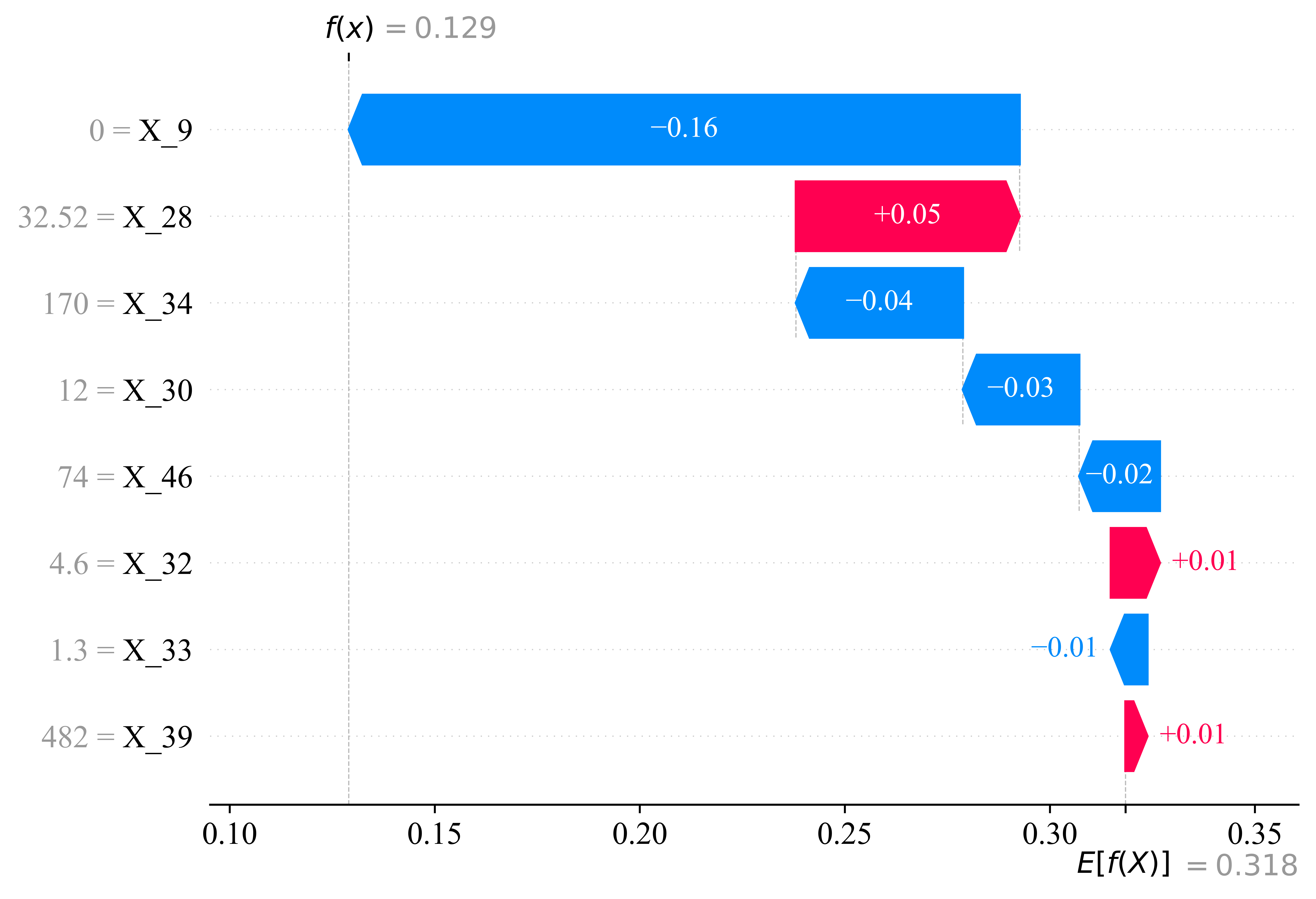 if True: X = df.drop(['y'], axis = 1) y = df['y'] X_train, X_test, y_train, y_test = train_test_split( X, y, test_size = 0.3, random_state = 42, stratify = df['y'] ) if True: lgbm_clf = lgb.LGBMClassifier(random_state = 42, verbose = -1) lgbm_clf.fit(X_train, y_train) feature_importances = lgbm_clf.feature_importances_ feature_importance_df = pd.DataFrame({ 'Feature': X.columns, 'Importance': feature_importances }).sort_values(by = 'Importance', ascending = False) top_n = 30 top_features = feature_importance_df.head(top_n) plt.figure(figsize = (12, 8), dpi = 1200) plt.barh(top_features['Feature'], top_features['Importance'], color = 'skyblue') plt.xlabel('Importance', fontsize = 14) plt.ylabel('Feature', fontsize = 14) plt.title(f'Top {top_n} Feature Importance', fontsize = 16) plt.xticks(fontsize = 12) plt.yticks(fontsize = 12) plt.gca().invert_yaxis() plt.savefig(f'{wkdir}/特征筛选.png', bbox_inches = 'tight') plt.close() if True: selection_results = pd.DataFrame(columns = ['Feature', 'Importance', 'Mean_ROC']) selected_features = [] kf = KFold(n_splits = 5, shuffle = True, random_state = 42) n_splits = kf.get_n_splits() fold_columns = [f'Fold_{i+1}_ROC' for i in range(n_splits)] for i in range(len(top_features)): current_feature = top_features.iloc[i]['Feature'] selected_features.append(current_feature) fold_roc_scores = [] for train_idx, val_idx in kf.split(X_train): X_train_fold, X_val_fold = X_train.iloc[train_idx][selected_features], X_train.iloc[val_idx][selected_features] y_train_fold, y_val_fold = y_train.iloc[train_idx], y_train.iloc[val_idx] lgbm_clf = lgb.LGBMClassifier(random_state = 42, verbose = -1) lgbm_clf.fit(X_train_fold, y_train_fold) y_val_proba = lgbm_clf.predict_proba(X_val_fold)[:, 1] fold_roc_score = roc_auc_score(y_val_fold, y_val_proba) fold_roc_scores.append(fold_roc_score) mean_roc_score = np.mean(fold_roc_scores) row_data = { 'Feature': current_feature, 'Importance': top_features.iloc[i]['Importance'], 'Mean_ROC': mean_roc_score, } for j, score in enumerate(fold_roc_scores): row_data[fold_columns[j]] = score row_df = pd.DataFrame([row_data]) selection_results = pd.concat([selection_results, row_df], ignore_index = True) selection_results if True: selection_results['Importance'] = ( selection_results['Importance'] / selection_results['Importance'].sum() ) selection_results if True: fold_columns = [col for col in selection_results.columns if 'Fold_' in col] selection_results['CI_Lower'] = None selection_results['CI_Upper'] = None for index, row in selection_results.iterrows(): fold_roc_scores = [row[fold] for fold in fold_columns] n_folds = len(fold_roc_scores) mean_roc = row['Mean_ROC'] std_err = stats.sem(fold_roc_scores) t_value = stats.t.ppf(0.975, df=n_folds - 1) ci_lower = mean_roc - t_value * std_err ci_upper = mean_roc + t_value * std_err ci_upper = min(ci_upper, 1) selection_results.at[index, 'CI_Lower'] = ci_lower selection_results.at[index, 'CI_Upper'] = ci_upper selection_results if True: selection_results['Importance'] = pd.to_numeric(selection_results['Importance'], errors = 'coerce') selection_results['CI_Lower'] = pd.to_numeric(selection_results['CI_Lower'], errors = 'coerce') selection_results['CI_Upper'] = pd.to_numeric(selection_results['CI_Upper'], errors = 'coerce') n_features = 7 fig, ax1 = plt.subplots(figsize = (16, 6), dpi = 1200) norm = plt.Normalize(selection_results['Importance'].min(), selection_results['Importance'].max()) colors = plt.cm.Blues(norm(selection_results['Importance'])) ax1.bar(selection_results['Feature'], selection_results['Importance'], color = colors, label = 'Feature Importance') ax1.set_xlabel("Features", fontsize = 18, fontweight = 'bold') ax1.set_ylabel("Feature Importance", fontsize = 18, fontweight = 'bold') ax1.tick_params(axis = 'y', labelsize = 12, width = 1.5) x_labels = selection_results['Feature'] x_colors = ['red' if i < n_features else 'black' for i in range(len(x_labels))] for tick_label, color in zip(ax1.get_xticklabels(), x_colors): tick_label.set_color(color) ax1.tick_params(axis = 'x', rotation = 45, labelsize = 12, width = 1.5) ax2 = ax1.twinx() ax2.plot( selection_results['Feature'][:n_features + 1], selection_results['Mean_ROC'][:n_features + 1], color = "red", marker = 'o', linestyle = '-', label = "Mean AUC (Top Features)" ) ax2.plot( selection_results['Feature'][n_features:], selection_results['Mean_ROC'][n_features:], color = "black", marker = 'o', linestyle = '-', label = "Mean AUC (Other Features)" ) ax2.fill_between( selection_results['Feature'], selection_results['CI_Lower'], selection_results['CI_Upper'], color = 'red', alpha = 0.2, ) ax2.set_ylabel("Mean AUC", fontsize = 18, fontweight = 'bold') ax2.tick_params(axis = 'y', labelsize = 12, width = 1.5) ax2.yaxis.set_major_formatter(plt.FuncFormatter(lambda x, _: f'{x:.3f}')) plt.title(f"Feature Contribution and AUC Performance (Top {n_features} Features Highlighted)", fontsize = 18, fontweight = 'bold') fig.tight_layout() plt.savefig(f"{wkdir}/特征曲线.png", bbox_inches = 'tight') plt.close() list(selection_results['Feature'][0:8]) if True: X = df[['X_30', 'X_39', 'X_46', 'X_32', 'X_34', 'X_33', 'X_9', 'X_28']] y = df['y'] X_train, X_test, y_train, y_test = train_test_split( X, y, test_size = 0.3, random_state = 42, stratify = df['y'] ) if True:
